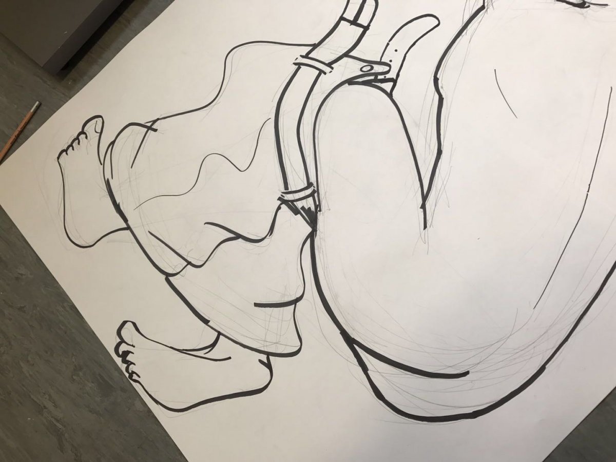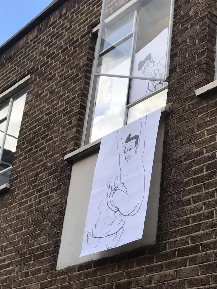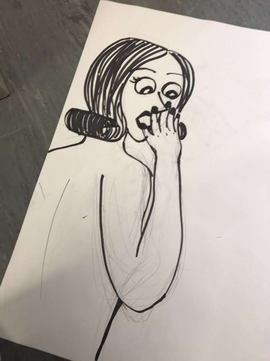 This afternoon I started to consider what I could draw on the paper like this size. I observed the environment around me and tried to find a perfect location to place my drawings. I looked out of the window and I realized that the windowsill upstairs was a good place because the audience could see the work through the window. I decided to draw something that can be hung on the windowsill, and also I wanted to draw a lesson from the American black humor style this time. The pictures of my drawing process are shown under this text box. At the end of today my work had been praised a lot from my tutor and ma classmates. I was glad that these people liked it. But because of the size of the paper I couldn't draw them very detailed. And I was not very good to control the proportion of the figures on A0 paper so it has told me that I need keep practicing me drawing skills.