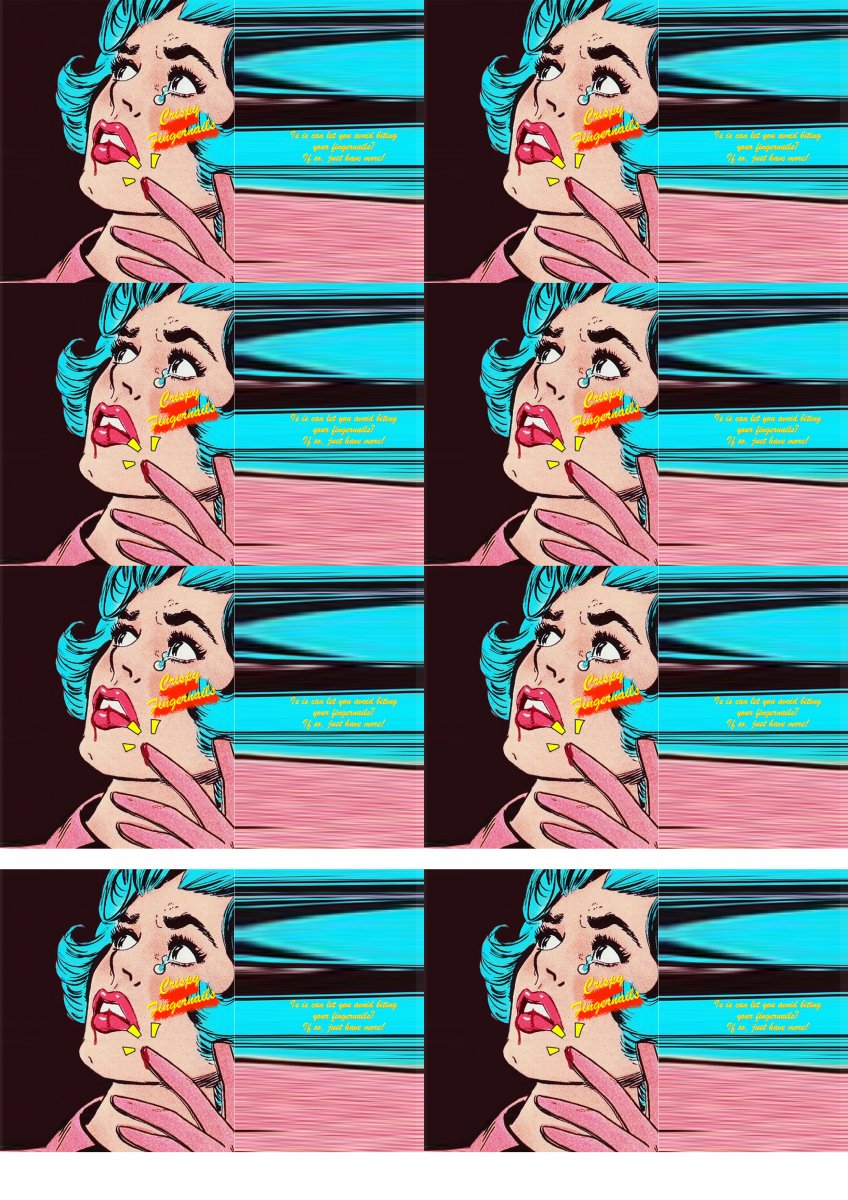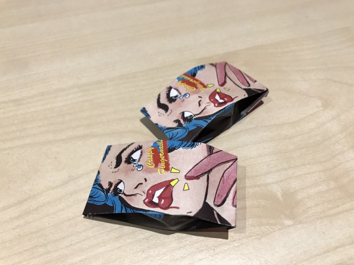 Today was a one day project. We have planed about what we would do today on last day afternoon so we started our work quickly in the morning. My target today is design the packaging for my fingernail snack. I did some research about food packaging because I need to know the structure of them. And also I sought some interesting packaging design including snacks and candies omniscience's the Internet. There was one which has impressed me a lot. it was a sour lemon candy and its bag was drawn by a pop art style. I thought it was quite suitable for my snacks because it looked special and unique. At first I want to draw a pop art style painting by myself but the time was too tight so I edited a existed pop art drawing as a experiment in order to see the effect quickly.